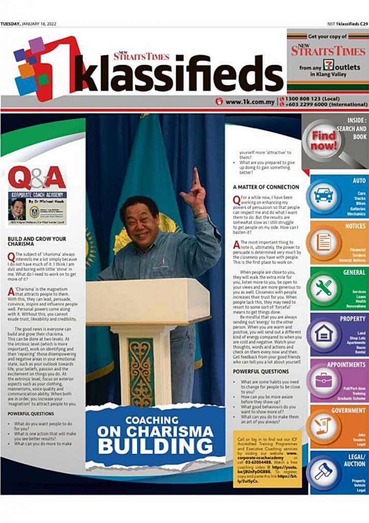 Call or log in to find out our ICF Accredited Life Coaching Programmes and Executive Coaching services by visiting our website www.corporate-coachacademy or call 03-62054488.