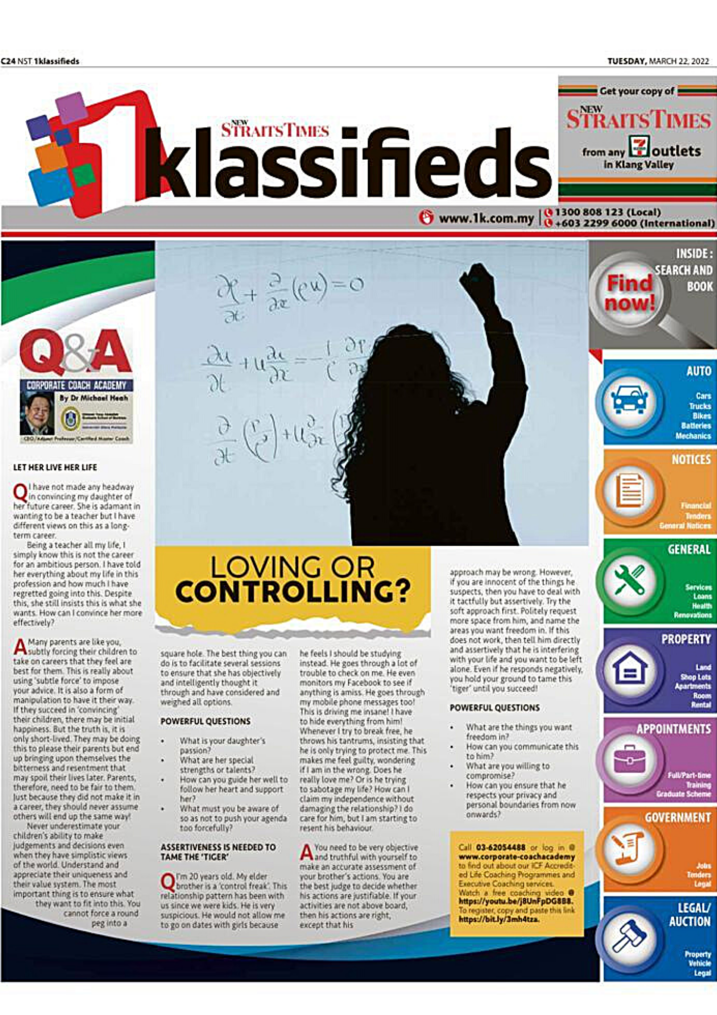 Call 03-62054488 or log in @www.corporate-coachacademy to find out about our ICF Accredited Life Coaching Programmes and Executive Coaching services.